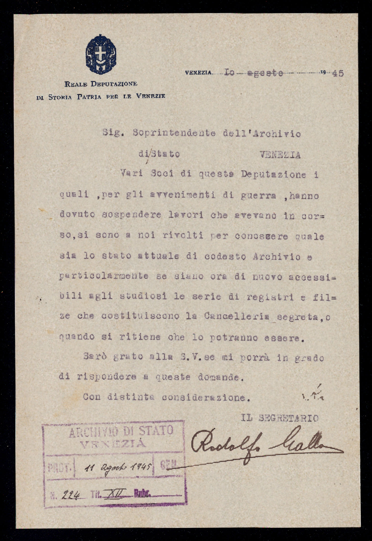 Rodolfo Gallo, studioso di storia e arte veneziana, assiduo frequentatore dell’Archivio e all’epoca segretario della Deputazione, si fece portavoce delle richieste dei soci, scrivendo al direttore Eugenio Ronga per ottenere chiarimenti sulle reali possibilità di riprendere le ricerche nella sala di studio dei Frari. Sebbene l’Istituto avesse garantito la continuità dell’apertura al pubblico durante tutte le fasi del conflitto, i fondi archivistici di maggior rilievo erano stati trasferiti in terraferma per proteggerli dal rischio di un coinvolgimento diretto di Venezia nelle operazioni belliche. Il 10 agosto 1945, Gallo sollevò proprio questa questione, sottolineando come gli studiosi, a causa della guerra, avessero dovuto interrompere i propri lavori e lasciando trasparire l’urgenza di superare le difficoltà del passato per tornare rapidamente alla normalità.